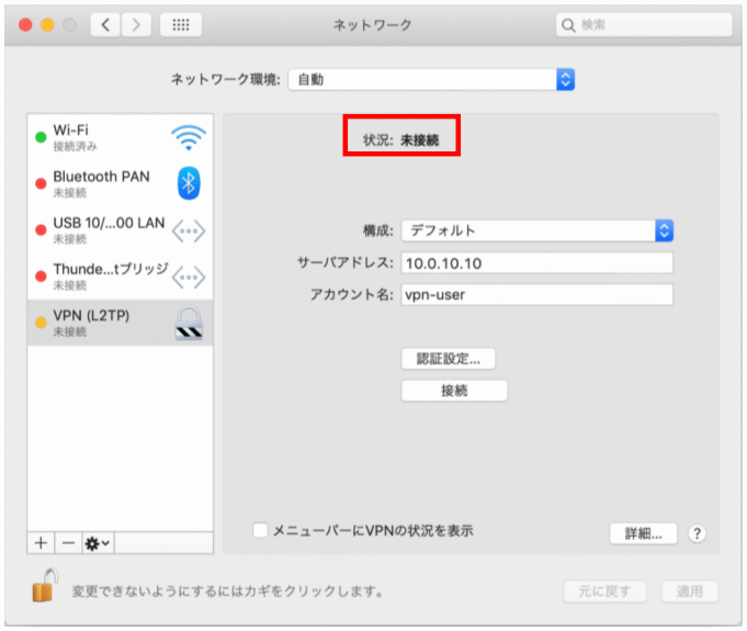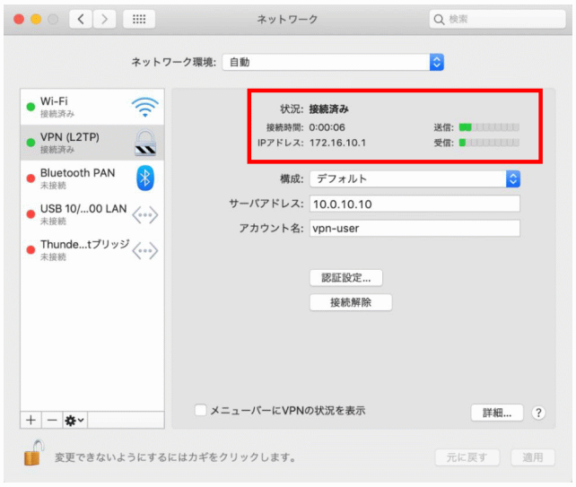 macOS では VPN 接続の状況をメニューバーに表示することができます。この設定により、システム環境設定を開かずにVPN の接続・切断を行うことが可能です。