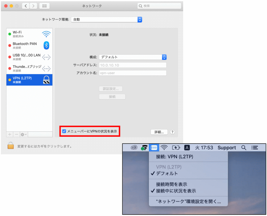 - 【メニューバーにVPN の状況を表示】にチェックを入れます
