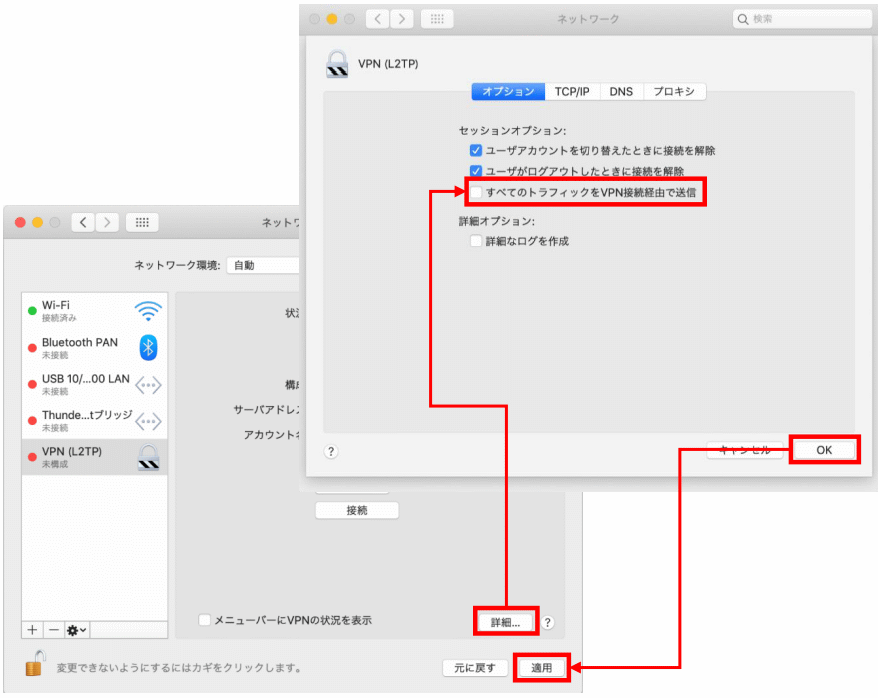 - 「オプション」タブで【すべてのトラフィックをVPN接続経由で送信】にチェックを入れます