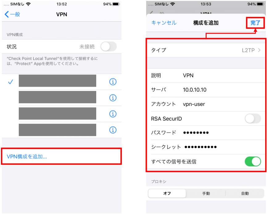 | 共有シークレット | 1-2で設定した「L2TP事前共有キー」 |