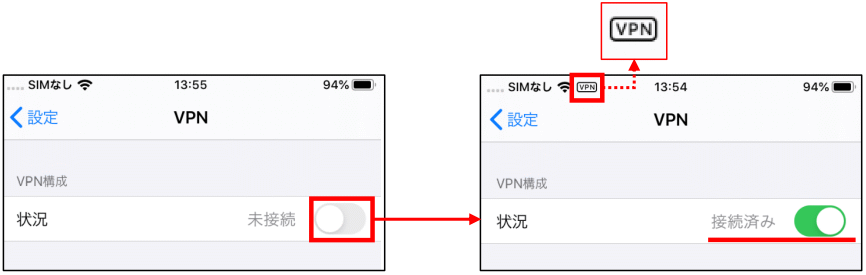 - 【接続済み】と表示され、画面上部に【VPN】と表示されたら接続完了です