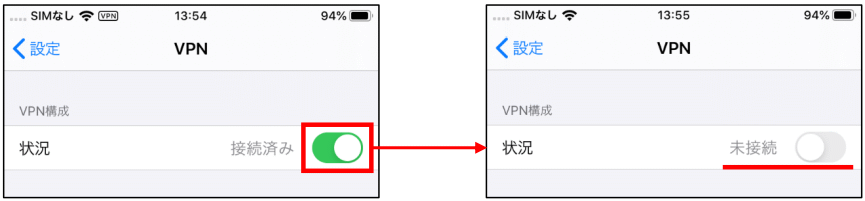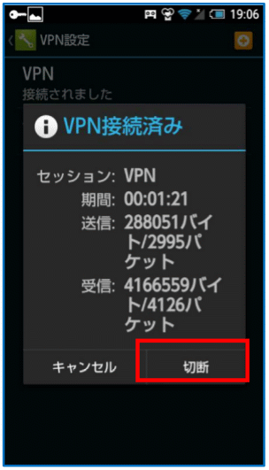 - VPN のステータスが表示されるため、【切断】をタップします