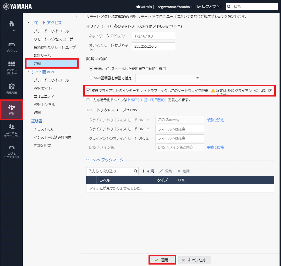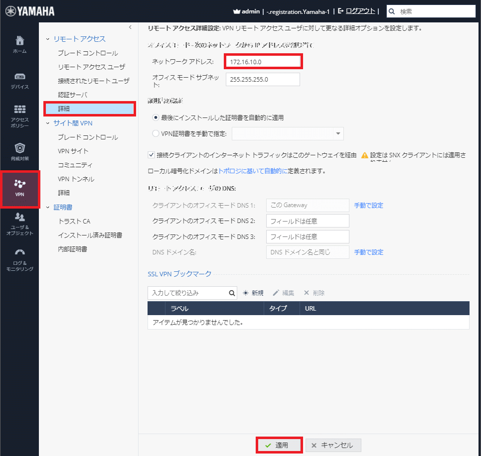 - 完了後、画面下部の【適用】をクリックし、設定を反映します