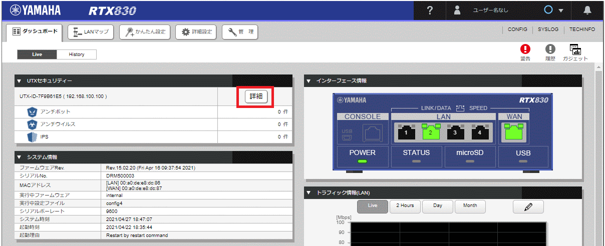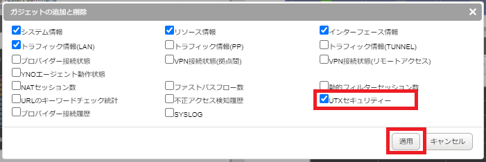以下の手順でヤマハルーターのダッシュボードに「UTXセキュリティーガジェット」を表示します。