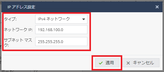 | タイプ | IPv4ネットワーク (設定を変更すると、下記の設定項目の表示が変わります) |