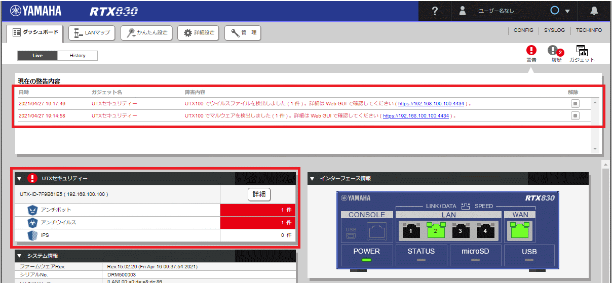※ 検出されたインシデントの詳細は、UTX100のWeb GUIを開き、[ホーム]-[レポート]で表示されるセキュリティーレポートを確認してください。セキュリティーレポートの表示内容は、「セキュリティーレポート活用ガイド」を参考にしてください。