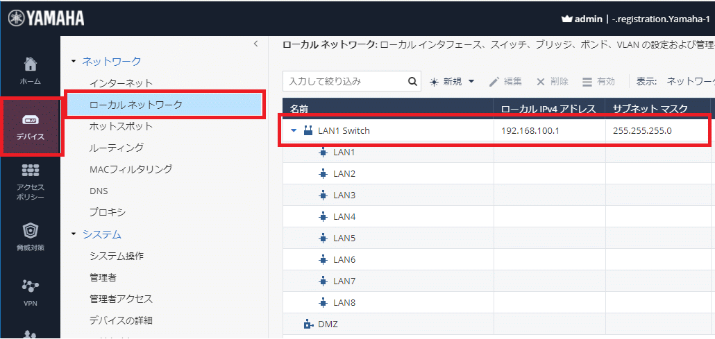 - 左のメニューから【デバイス】 > 【ローカルネットワーク】メニューを開きます