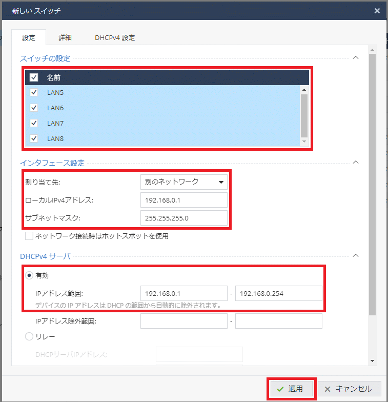 - DHCPサーバー機能が必要な場合は、DHCPv4サーバを【有効】にし、割り当て範囲を設定します
