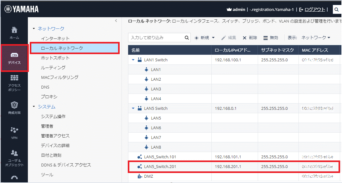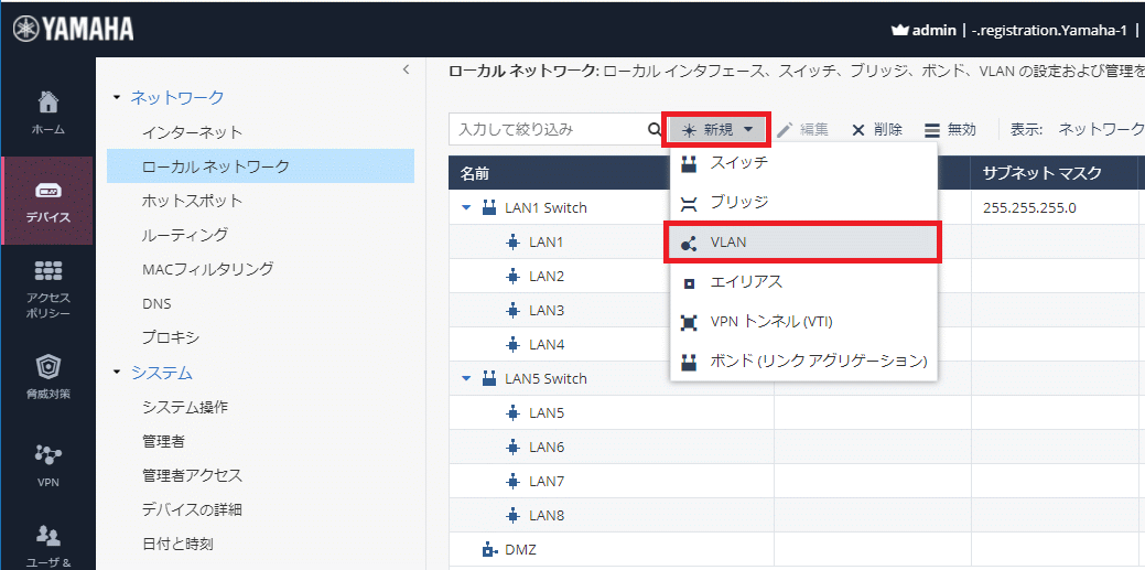 - 左のメニューから【デバイス】 > 【ローカルネットワーク】メニューを開き、【新規】より【VLAN】をクリックします
