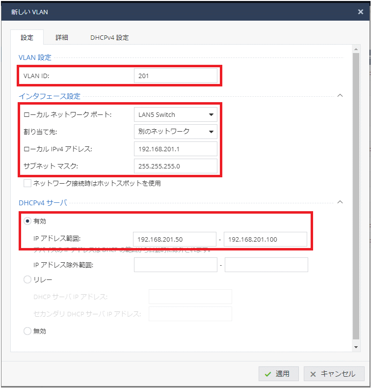 - 新しいVLANの作成画面でVLAN IDを【201】と指定します