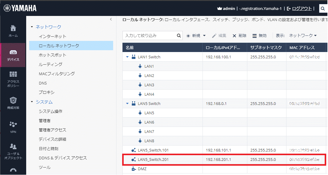 以上でVLAN ID:101の構成は完了です。続いてVLAN ID:201を構成するため、再度【新規】より【VLAN】を作成します。