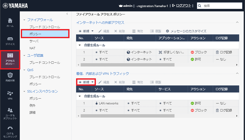 - 「着信、内部およびVPNトラフィック」の【新規】より新規ルールを作成します
