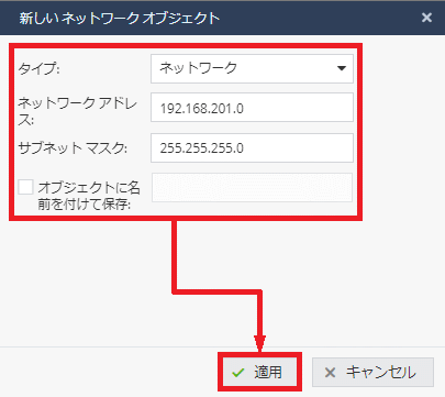 - 【新しいネットワークオブジェクト】作成画面が開くので、以下のように指定します