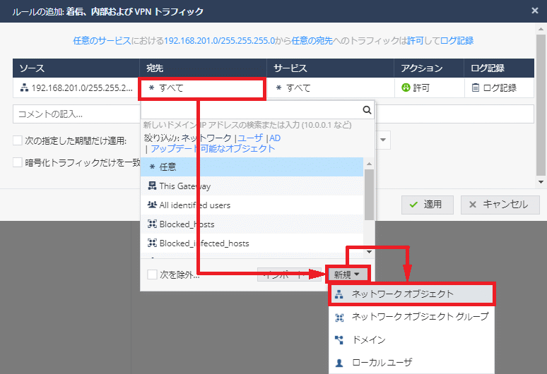 - 「5-3. ネットワークオブジェクトの作成」と同じ手順で、宛先のネットワークオブジェクトを作成します