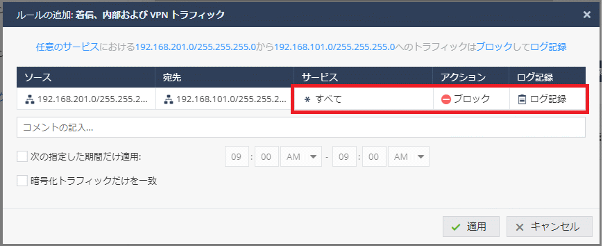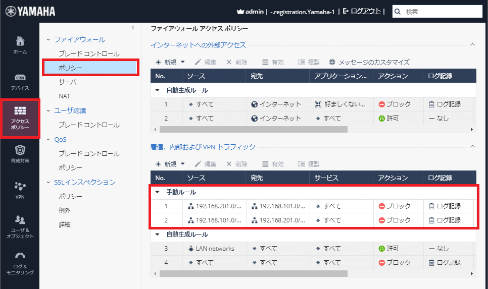 VLAN ID:101(192.168.101.0/24) とVLAN ID:201(192.168.201.0/24) のセグメントが互いにアクセスできないようにする場合は、「6. タグVLANアクセスポリシーの追加」との手順を参考にして、192.168.101.0/24 → 192.168.201.0/24 をブロックするポリシーを作成します。