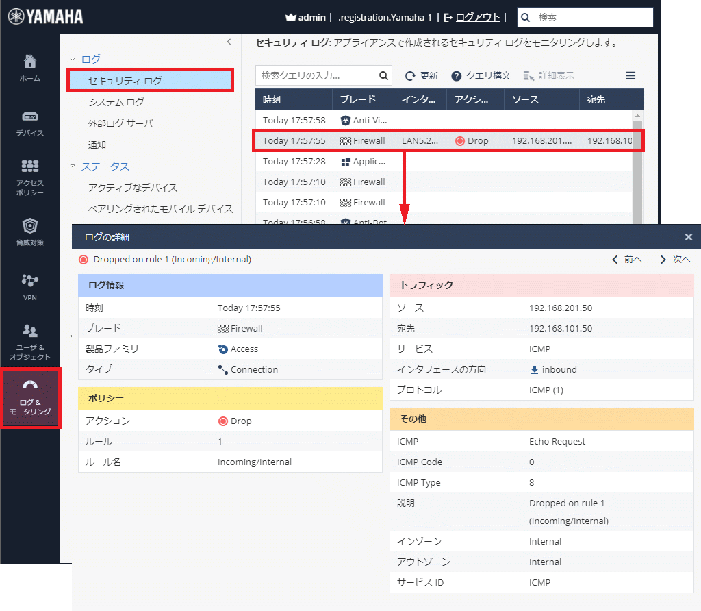 PC3:192.168.201.50 (VLAN ID:201) から PC2:192.168.101.50 (VLAN ID:101) に対してPingを実施します。セキュリティーログを確認すると、「rule 1」によってブロックされていることが確認できます。