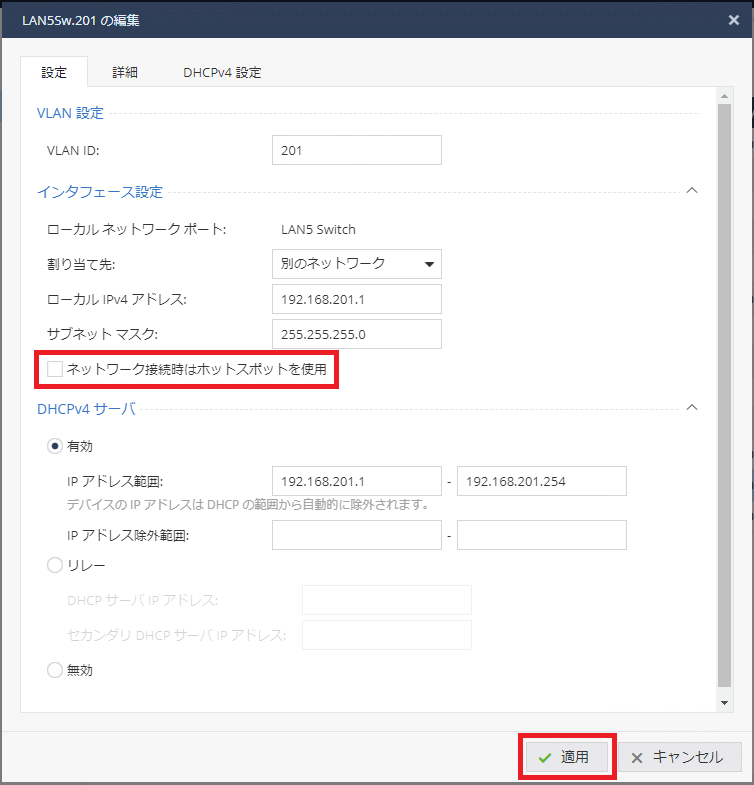 ゲスト用のネットワークに対してホットスポットを設定します。ここでは、「VLAN ID:201」をゲスト用ネットワークとして設定します。