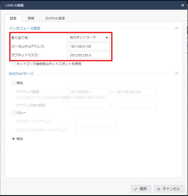 ※ [ローカルIPv4アドレス]と[サブネットマスク]には任意の値を設定してください