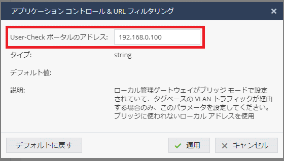 アプリケーションコントロール機能やURLフィルタリング機能などで表示されるブロック画面は、リダイレクトポートに設定したアドレス(User-Checkポータルのアドレス)にリダイレクトされて表示されます。