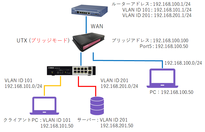 UTX100/UTX200で、ブリッジモード時にタグVLANのネットワークを構成するための手順になります。