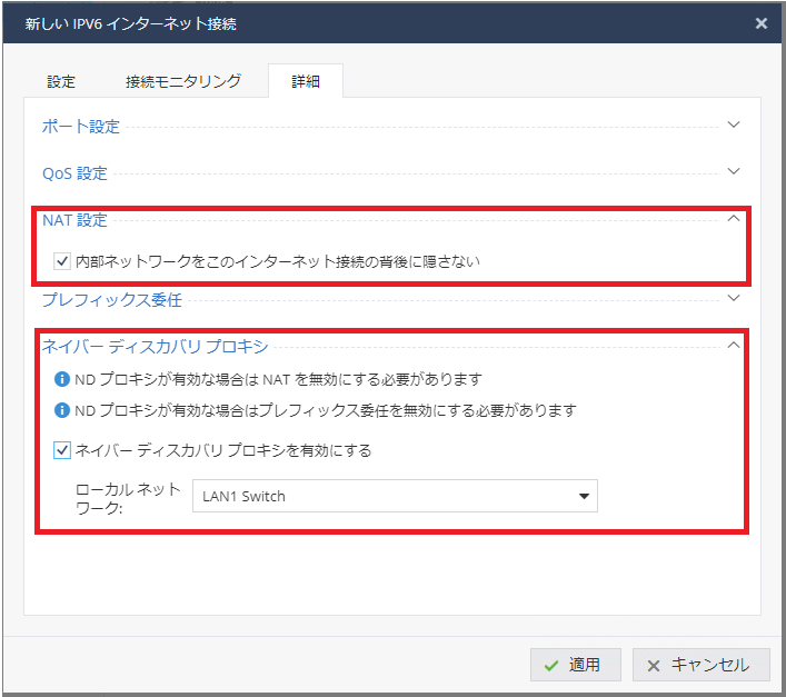 [DHCPv6-PD]のIPv6インターネット接続設定を行い、下記条件に一致するかを確認します。