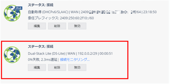 ※ インターネット接続確立後、インターネットの接続状態に委任されたプレフィックス情報が表示される