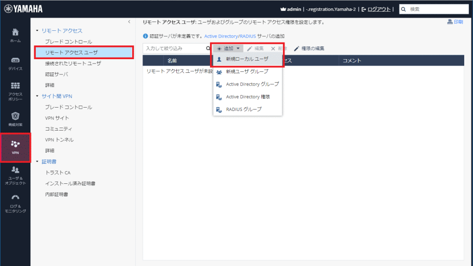 - Web GUIの左のメニューから【VPN】タブ > 【リモートアクセス】 > 【リモートアクセスユーザ】とメニューを開きます