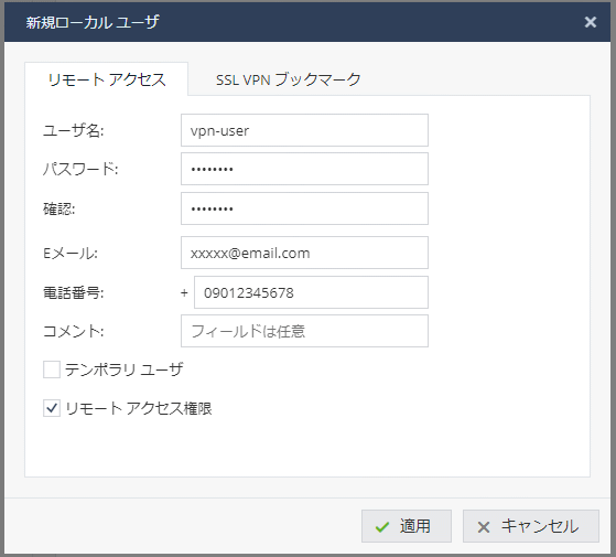 - 【新規】をクリックし、「新規ローカルユーザ」画面に情報を入力します