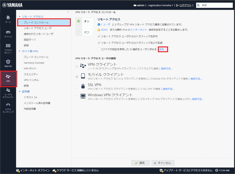 - 「VPN」タブ > 「リモートアクセス」-【ブレードコントロール】メニューを開きます