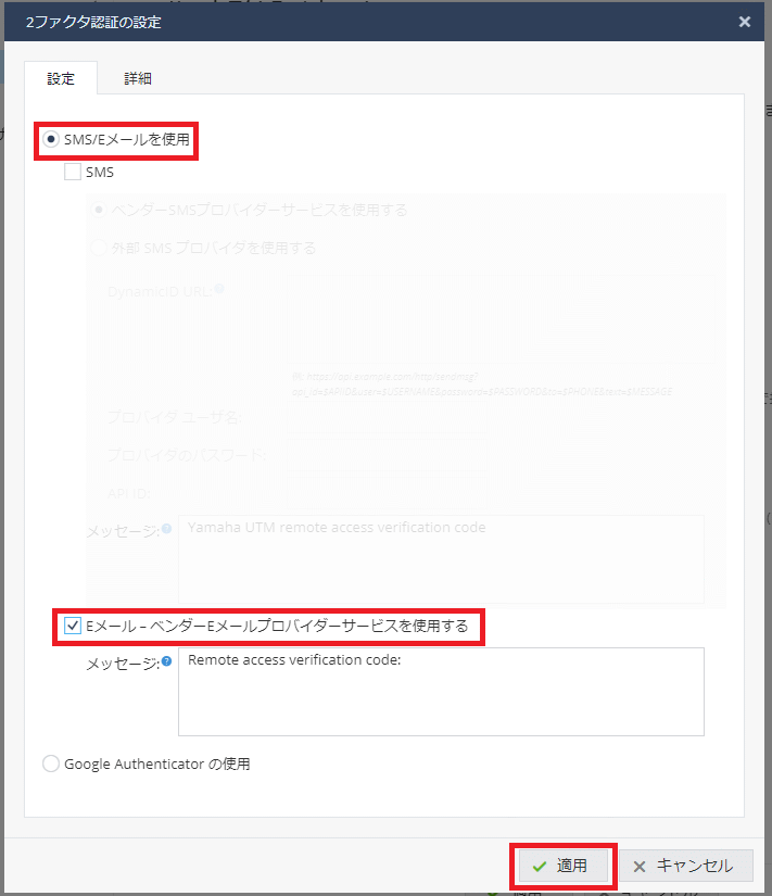 - 「ベンダーSMSプロバイダサービスを使用する」を選択します