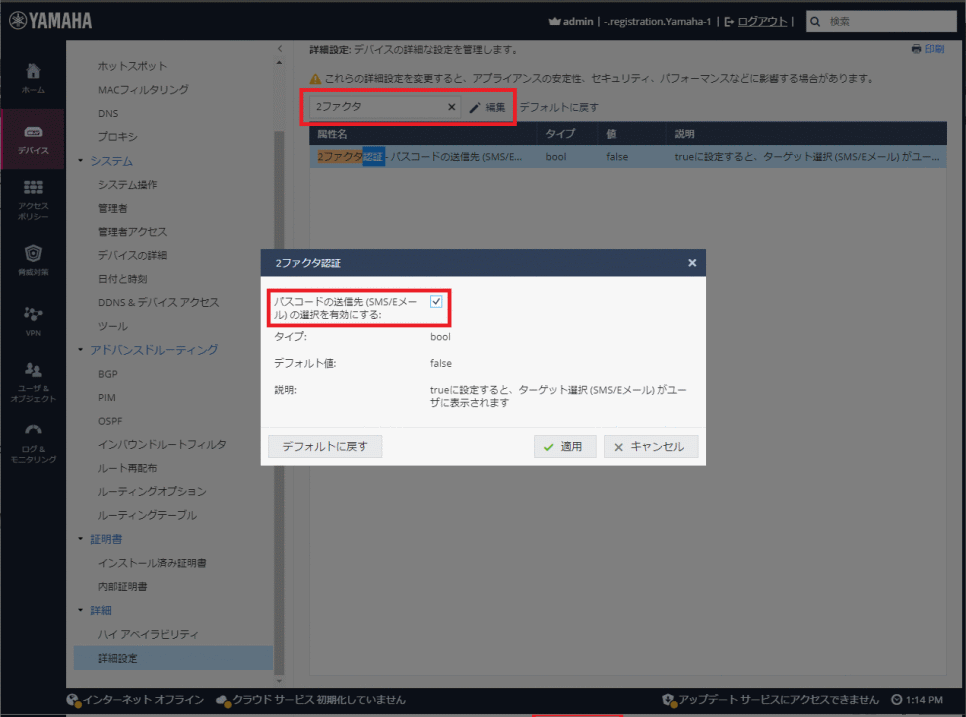 - 「2ファクタ認証 - パスコードの送信先 (SMS/Eメール) の選択を有効にする」を選択し、【編集】をクリックします