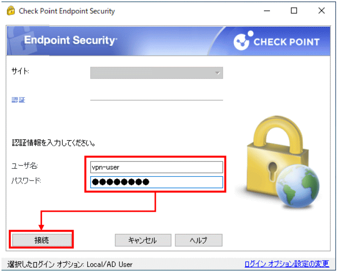 - ユーザー名とパスワードを入力し【接続】をクリックします