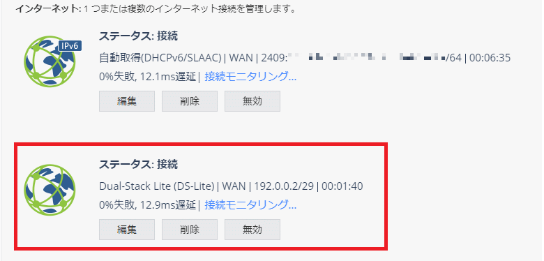 ※ インターネット接続確立後、インターネットの接続状態に委任されたプレフィックス情報が表示される