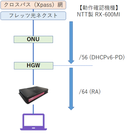 クロスパス(Xpass)網からDHCPv6-PDで /56 のプレフィックスがHGWに割り当てられ、HGWからはRAで /64 のプレフィックス(取得した /56 の先頭 /64)が広告されます。