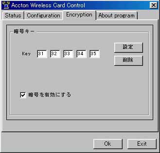 - 設定ユーティリティの [Encryption] −「暗号を有効にする」をチェックし、 [Key] に任意の16進数を入力し、[設定] ボタンを押します。
