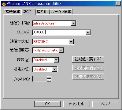 - 設定ユーティリティ(Wireless LAN Configuration Utility)の [設定] − [SSID] に、RT60wに設定したESS-IDを入力します。