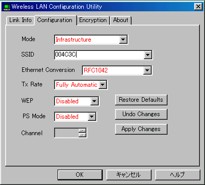 - 設定ユーティリティ(Wireless LAN Configuration Utility)の [Configuration] − [SSID] に、RT60wに設定したESS-IDを入力します。