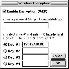 - [Enable Encryption(WEP)] をチェックし、「Key #1〜Key #4」に任意の16進数10桁のキーを入力します。