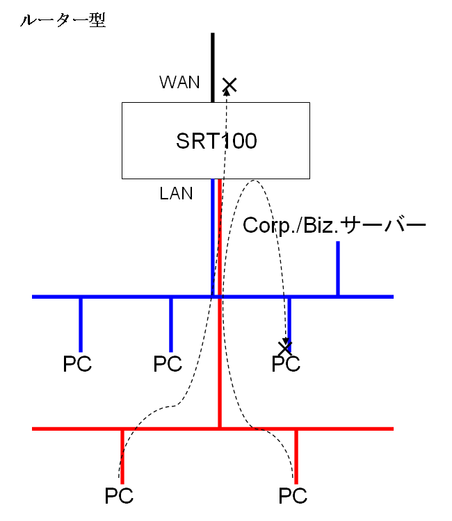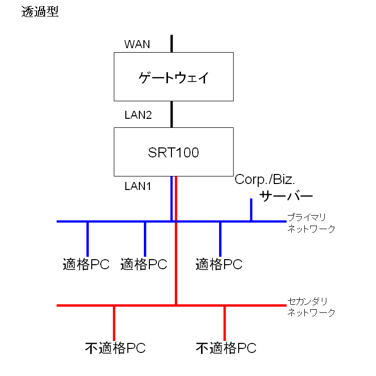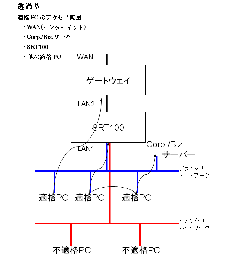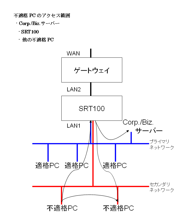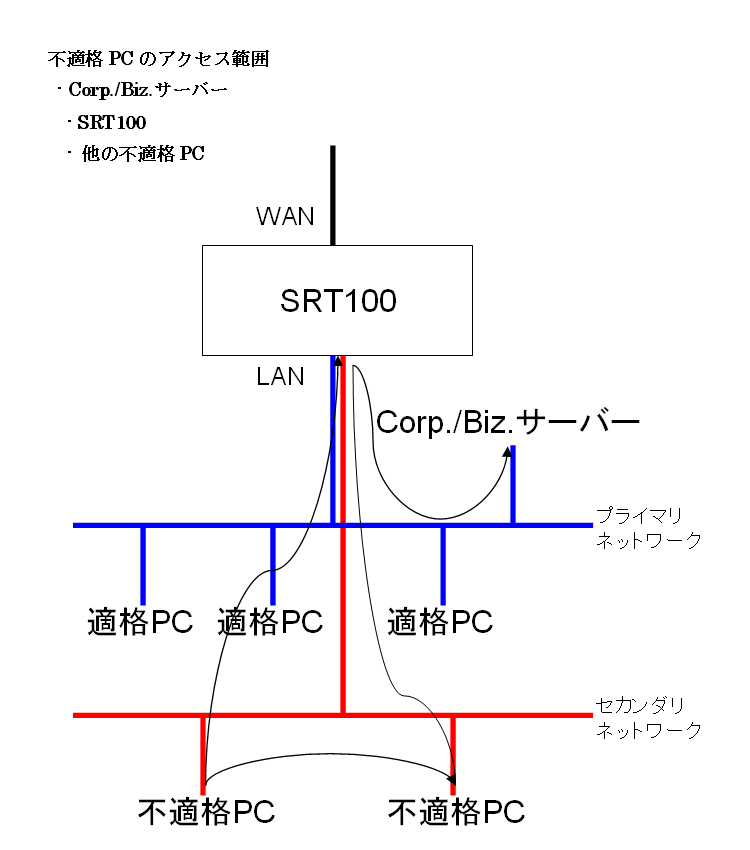 基本的には、適格PCからの通信はフィルタリング無し、不適格PCからの通信はLAN側の特定ネットワーク(セカンダリネットワーク)と管理サーバへのみアクセス可能となるようにフィルターを設定します。