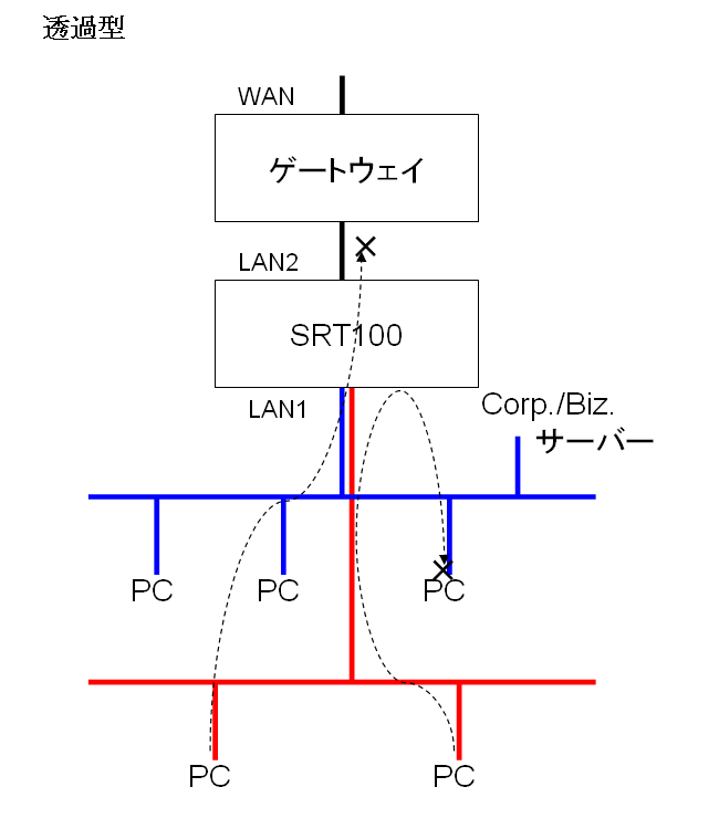 透過型(ブリッジ)の場合、LAN1、LAN2のどちらに端末を接続しても動作するようなフィルターを設定します。
