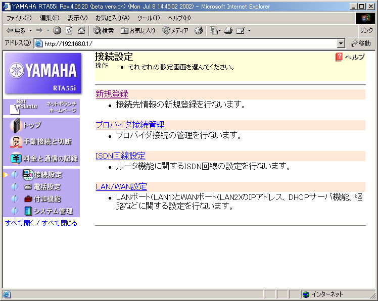 本社ネットワーク | | ------+---------+----+---- 192.168.10.0/24 LAN1 | .254 +--------+ | RT(1) | +--------+ LAN2 | 172.16.0.1 +----------+ |ADSLモデム| +----------+ | 接続プロバイダ | インターネット | 接続プロバイダ | +----------+ |ADSLモデム| +----------+ LAN2 | 不定 +--------+ | RT(2) | +--------+ LAN1 | .1 ------+---------+----+---- 192.168.0.0/24 | | 拠点ネットワーク本社側はADSLによるインターネット接続をしており、プロバイダより172.16.0.1の固定アドレスの割り当てを受けていると仮定します。 以下は拠点側でRTA55iを使用して本社ネットワークとLAN間接続を行うための設定例になります。