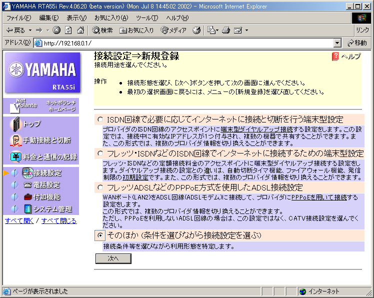ここでは、「そのほか(条件を選びながら接続設定を選ぶ)」を選択し、「次へ」ボタンを押してください。