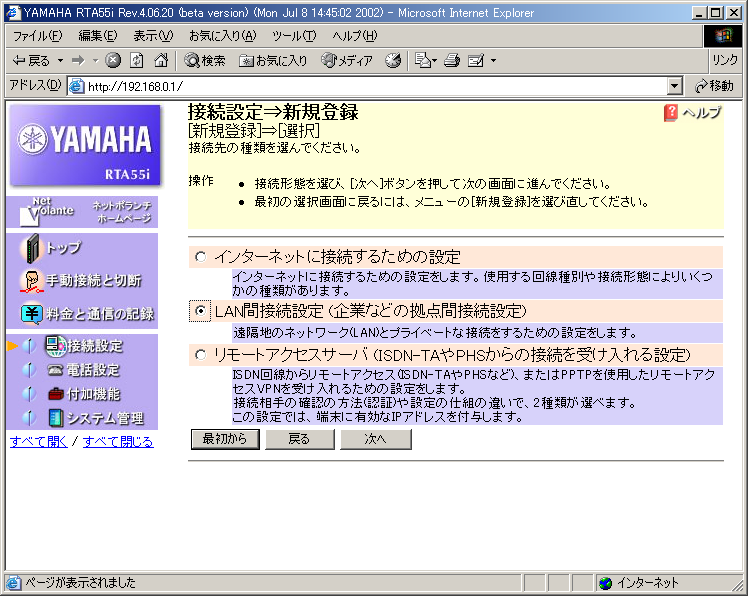 ここでは「LAN間接続設定(企業などの拠点間接続設定)」を選択し「次へ」ボタンを押してください。