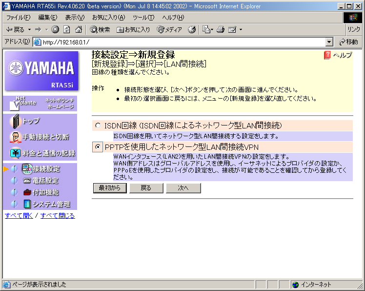 ここでは「PPTPを使用したネットワーク型LAN間接続VPN」を選択し「次へ」ボタンを押してください。