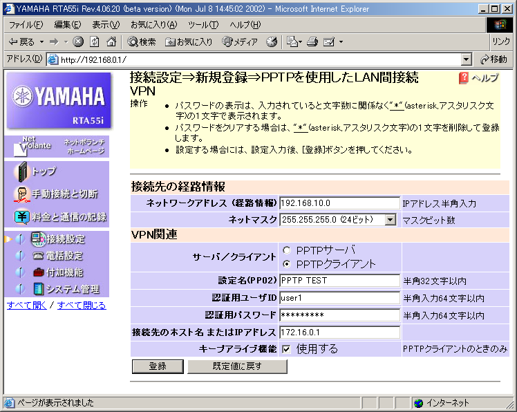 ここでPPTPによるLAN間接続VPNの詳細な設定を行います。