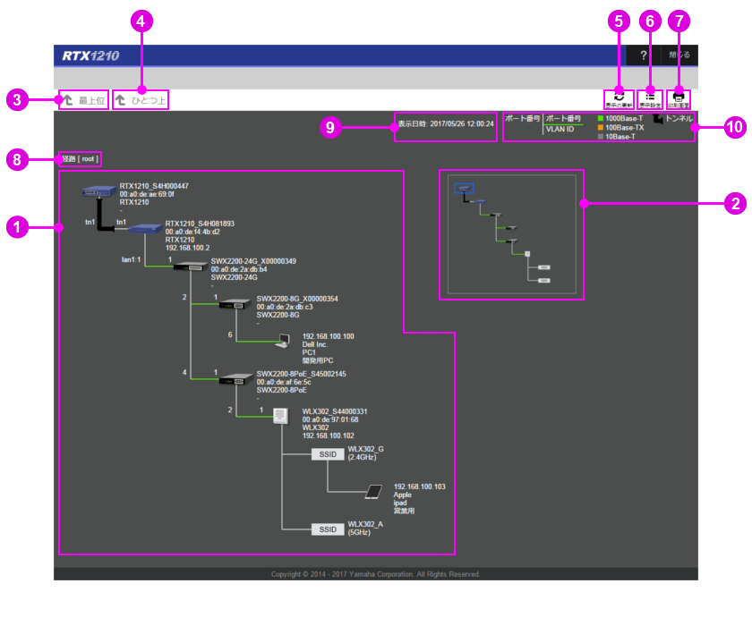 一覧マップは同じブロードキャストドメインに接続されている機器をトポロジーで表示します。トポロジーには「表示設定」で設定した情報を表示します。