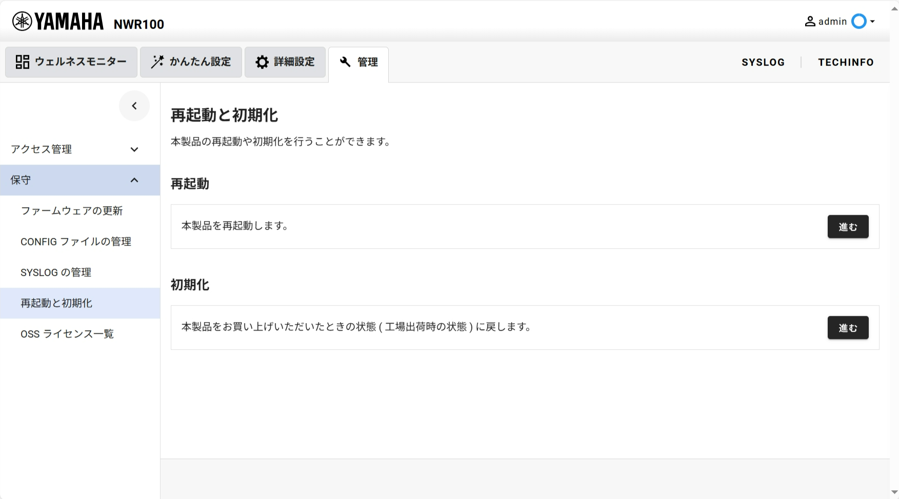 初期化は Web GUI 管理の [保守] - [再起動と初期化] ページで実行できます。