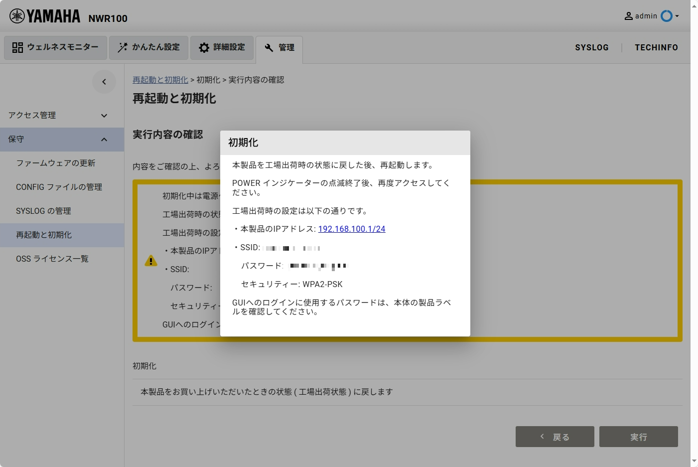 [管理] - [保守] - [再起動と初期化] 初期化の実行 確認画面