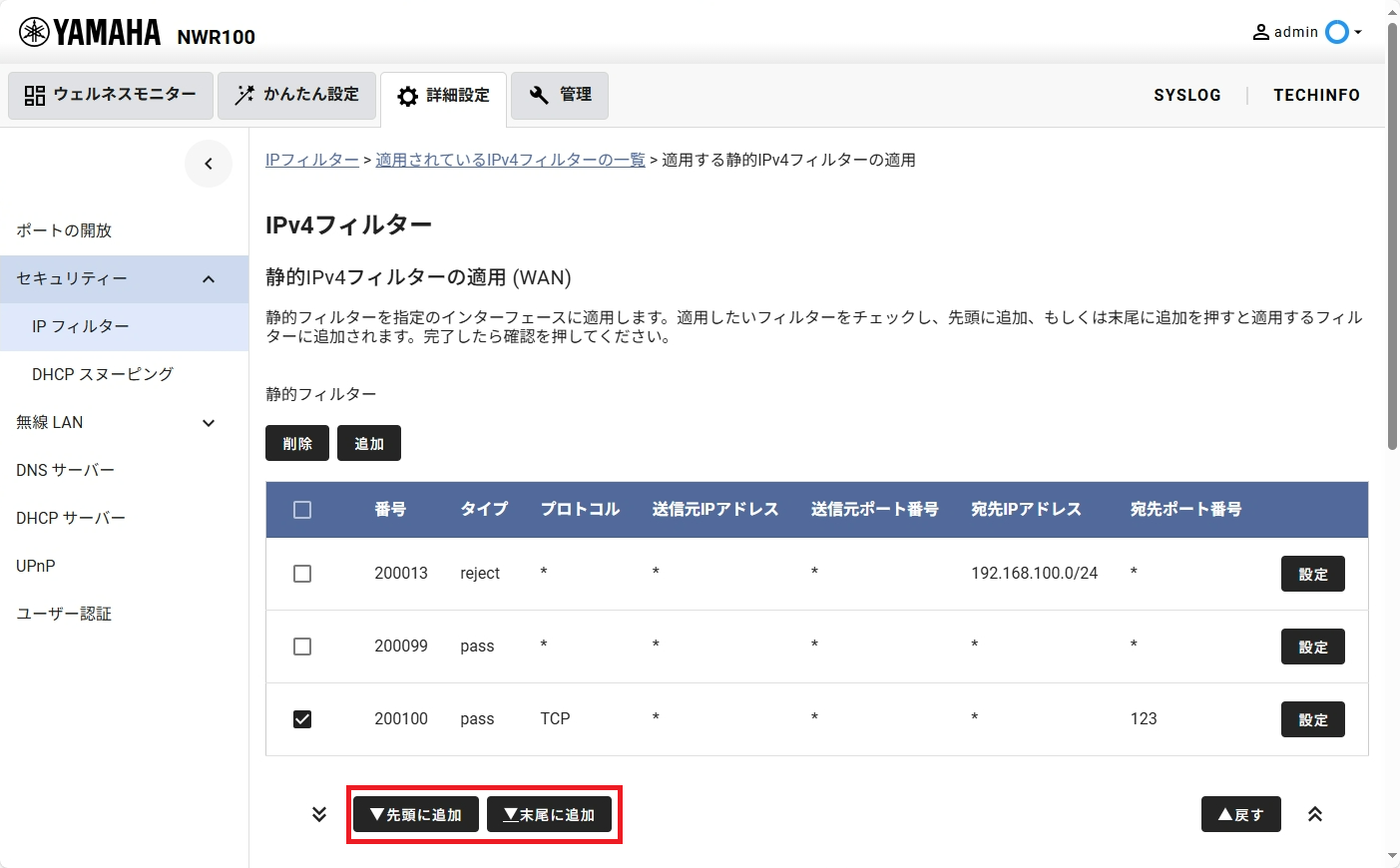 追加対象の IP フィルターにチェックを入れ、「先頭に追加」または「末尾に追加」をクリックします。