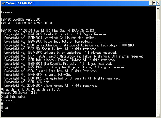 ここでは、Windows XP の TELNET を使用する場合を例に説明します。ヤマハルーター の IP アドレスは 192.168.100.1 とした場合の例です。